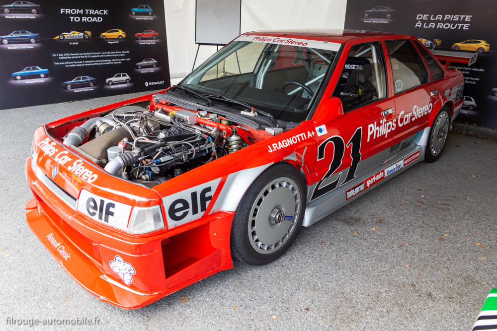 A côté, un échantillonnage de modèles Turbo qui ont porté les couleurs de Renault avec succès sur circuit et en rallye étaient du voyage : l’habituelle R5 Maxi Turbo de J. Ragnotti (on ne compte plus sa présence), la R5 Turbo, la R21 Turbo, la R11 Turbo gr. A.
